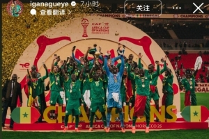效力埃弗顿的盖耶在社媒晒出了球队夺得非洲杯时的庆祝照,并配文写道: