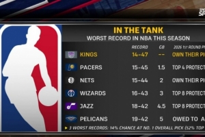 摆烂队首轮签详情:国王&篮网自己持有 步行者前4顺位保护