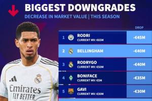 本赛季身价下跌TOP10:罗德里、贝林前二,维尔茨、萨卡降3000万